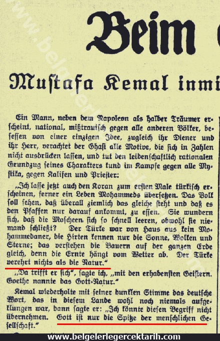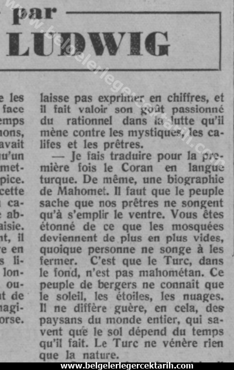 Yukarıda da ifade ettiğimiz gibi ABD Büyükelçisi Charles H. Sherrill’in kendi Dışişleri Bakanlığı’na gönderdiği ve M. Kemal’in din ile ilgili görüşlerini içeren raporun muhtevası bize yabancı değil. Zira o, daha 1929’un sonlarında Alman gazeteci Emil Ludwig’e verdiği ve 1930’da neşredilen mülakatında da benzer ifadeler kullanmıştı. Alman “Vossische Zeitung” gazetesinde çıkan mülakatın ilgili kısmının tercümesini buraya alıyorum: