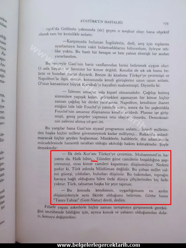 “Kuran’ı şimdi ilk defa Türkçe yayınlatıyorum, ayrıca (Hz.) Muhammed’in (sallallahu aleyhi vesellem) hayatını da tercüme ettiriyorum. Neredeyse tamamında aşağı yukarı aynı şeyler yazdığını, hocaların sadece karınlarını doyurmayı düşündüklerini halk görmelidir. Hiç kimse camileri kapatmadığı halde, bu kadar süratle boşalmasına şaşırmıyor musunuz? Türk, aslında Müslüman değildir. Çobanlar güneş, bulut ve yıldızlardan başka bir şey bilmezler. Bütün dünyadaki çiftçiler bunu böyle anlar, çünkü mahsul havaya bağlıdır. Türk, tabiattan başka hiçbir şeyi kutsal tanımaz.