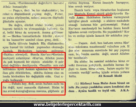 [25] Aynen cereyan etmiş olan bu hadiseyi, Hafız Asım Efendi’nin ağzından dinleyerek kaleme alan Ali Kemâlî Aksüt’tür. Bakınız; “Mustafa Kemal Paşa ve Kur’an Tercümesi”, Sebilürreşad Dergisi, cild 4, sayı 96, Şubat 1951, sayfa 328.