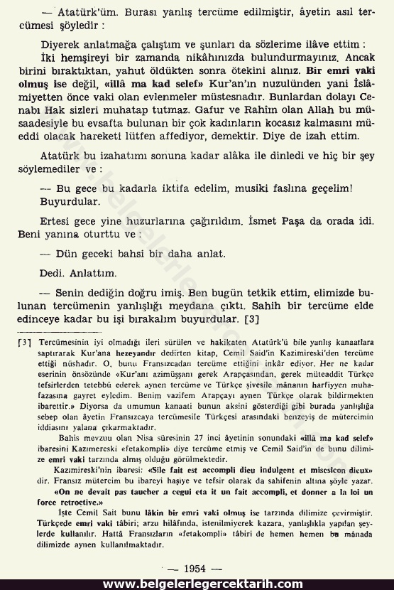 “Gösterdiği yer, Nisa süresinde hürmeti musahere ayetinin tercümesi idi. Bu ayette, “ve en tecmeu beynel uhteyni illâ mâ kad selef Innallahe kâne gafuren rahima” şöyle tercüme edilmişti: