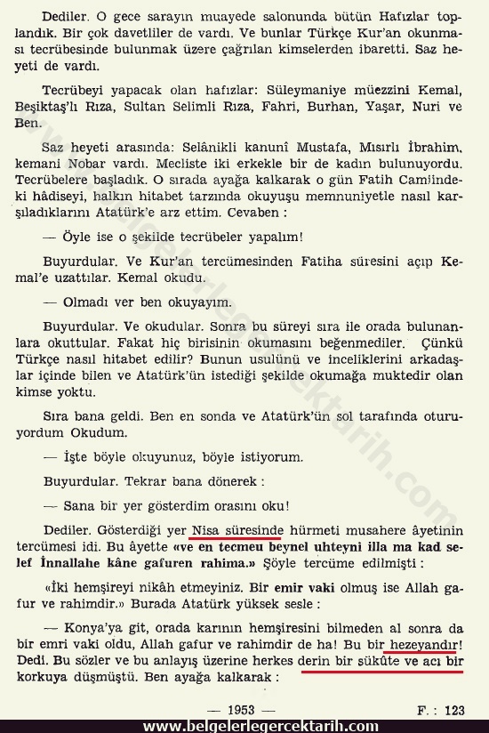 Atatürk o işaretli yerlerden birisini açtı ve okumasını hafız Sadettin’e emretti. Nisa süresinin hürmeti musahare ayeti idi. Bu ayette anaların, kızların, kardeşlerin, teyzelerin, halaların erkeklere haram olduğu beyan ediliyordu.