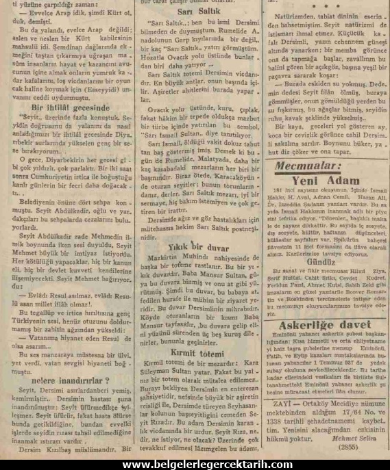“Çalışmadan yaşıyan, üfürükçülüğünü aleme rahmet bilen Seyit, Dersime niçin musallat olmuştur, bu binlerce insanın vicdanile, sayi (emeği) ile bir oyuncak gibi oynamak hakkını nereden almıştır, bilir misiniz? Asılsız yalan bir şecereden… Güya Seyitlerin topu birden peygamberin torunudur…”