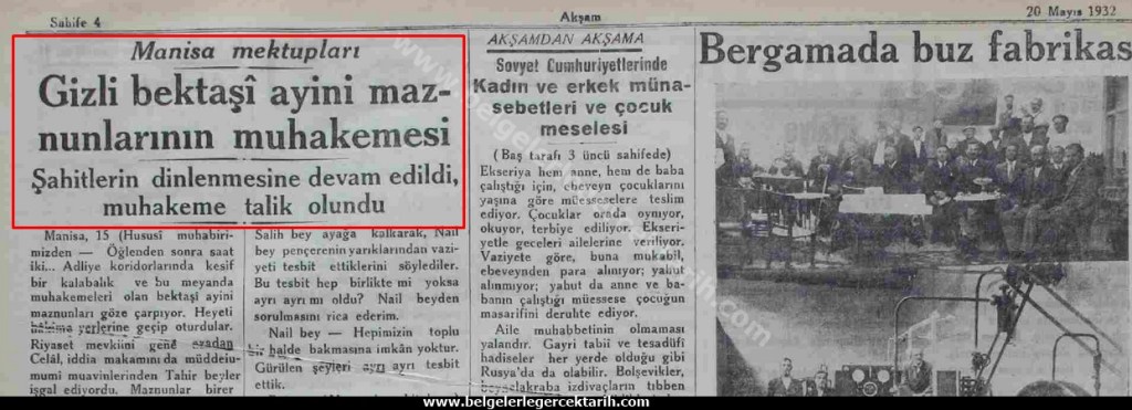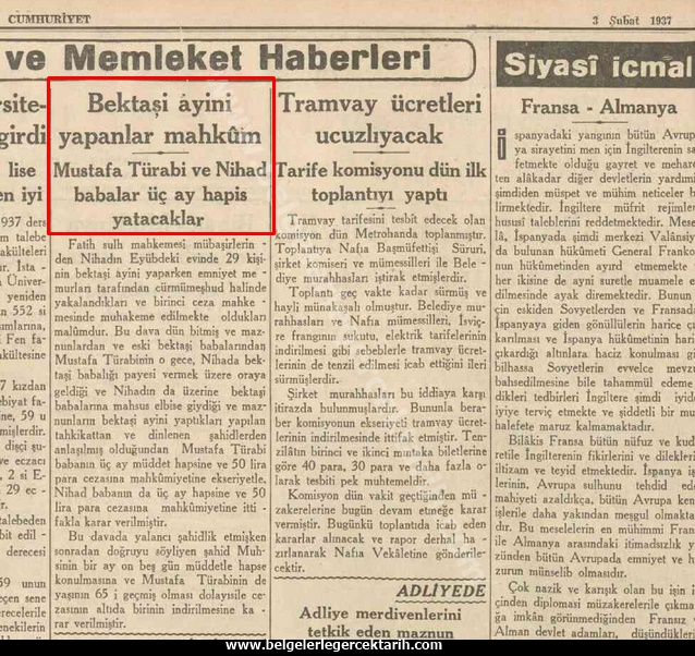 Son olarak “Cumhuriyet” gazetesinin 3 Şubat 1937 tarihli ve; “Bektaşi ayini yapanlar mahkum… Mustafa Türabi ve Nihad babalar üç ay hapis yatacaklar” başlıklı haberini okuyalım: