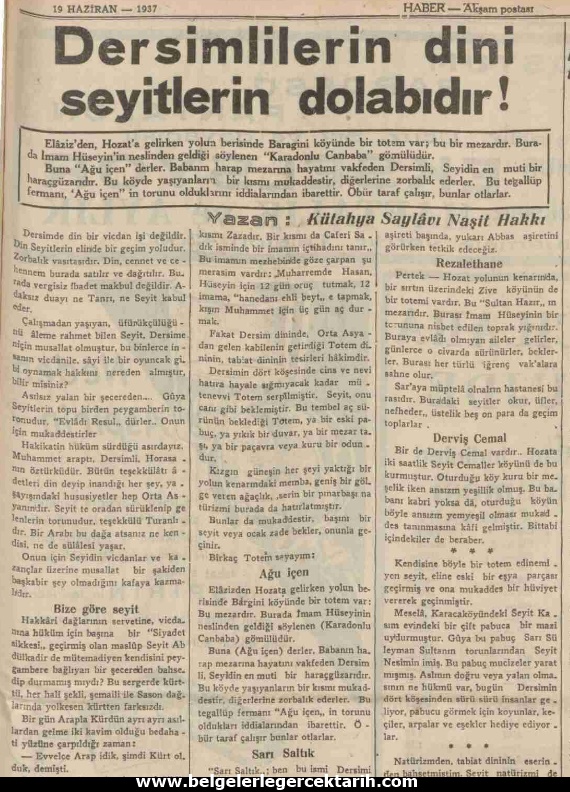 M. Kemal’in meclisinde kendine yer bulan CHP Kütahya Saylavı (Milletvekili) Naşit Hakkı Uluğ, 19 Haziran 1937 tarihli “Haber” gazetesinde “Dersimlilerin dini seyitlerin dolabıdır” başlıklı bir yazı kaleme alır. Dersim harekatı esnasında yayınlanan ve Dersimli Alevileri alçakça aşağılayan söz konusu paçavranın ilgili kısımlarını buraya alıp hiç yorum yapmadan yazımızı noktalayacağız: