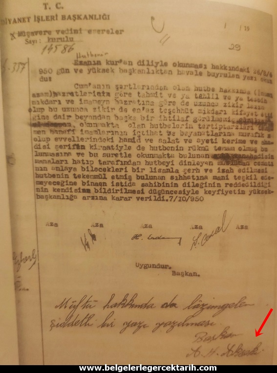 Ancak Rıfat Börekçi’nin 1924’deki beyanatında Arapça Hutbe taraftarı olduğu ve hatta bunun için “Arapça Hutbeler” tanzim etmeyi düşündüğü görülürken, gelen baskılardan sonra vaaz ve nasihat kısmının Türkçeleştirilmesine boyun eğdiği ve bir “ara formül”e razı edildiği anlaşılmaktadır. Bize göre onu ikna eden kişi Ahmed Hamdi Akseki olmuş ve zaten yukarıda da ifade edildiği üzere “Türkçe Hutbe” kitabını da o yazmıştır. Ayrıca CHP Tek Parti dönemi sona erip de Adnan Menderes’in Demokrat partisi iktidara gelince, tekrar Arapça Hutbe okunmasını talep eden bir Müftünün isteğini reddetmekle kalmamış, belgenin üzerine el yazısıyla; “Müftü hakkında lazımgelen şiddetli bir yazı yazılması”na dair not düşmüştü.[19] Akseki’nin tek parti zulmünün geride kalmasından istifade etmemiş olması yukarıdaki kanaatimizi perçinlemektedir.