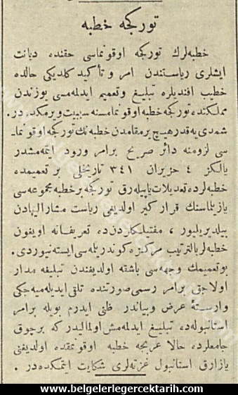“Hutbelerin Türkçe okunması hakkında Diyanet Işleri Riyaseti’nden emr-u te’kid geldiği halde, hatip efendilere tebliğ ve tamim edilmemesi yüzünden memlekette Türkçe Hutbe okunmamasına sebebiyet vermektedir. Şimdiye kadar hiçbir makamdan hutbenin Türkçe okunması lüzumuna dair sarih bir emir vürud etmemiştir. Yalnız Haziran 1341 (1925) tarihli bir tamimde hutbelerde tadilat yapılacak Türkçe bir Hutbe Mecmuası yazılmasının karargir olduğu Riyaset-i müşarün-ileyha’dan bildiriliyor, müftülüklerden de tarifata uygun hutbeler bi’t-tertib merkeze gönderilmesi isteniyordu. Bu tamimin veçhesi başka olduğundan, tebliğe medar olacak bir emr-i resmi suretinde telakki edilemeyeceği vareste-i arz-u beyandır zannederim. Böyle bir emir Istanbul’da tebliğ edilmemiş olmalıdır ki birçok camilerde hala Arapça Hutbe okunmakta olduğunu yazarak Istanbul gazeteleri şikayet etmektedir.”[15]