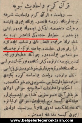 “Riyaset, Kur’an-ı Kerim ve ehadis-i şerife tercümelerinin lüzumuna kanidir. Bunun için yakında bir hey’et-i mütehassısa teşkil ederek bu mühim işi yapacaktır. Hutbeler hakkındaki kanaatimiz ise, yine hutbelerin Arapça, fakat elhan ve negamat ile değil, nesren okunarak hitamında (bitiminde) cemaate Türkçe tercümesinin söylenmesi yolundadır. Çünkü hutbeler Türkçeleştirilirse, namazlardaki kıraatin de Türkçeleştirilmesi meselesinin ortaya çıkarak hoşnutsuzluk yapması ihtimali vardır. Riyaset bu esasa göre yeniden Arapça hutbeler tanzimi hususunu düşünmektedir.”[12]