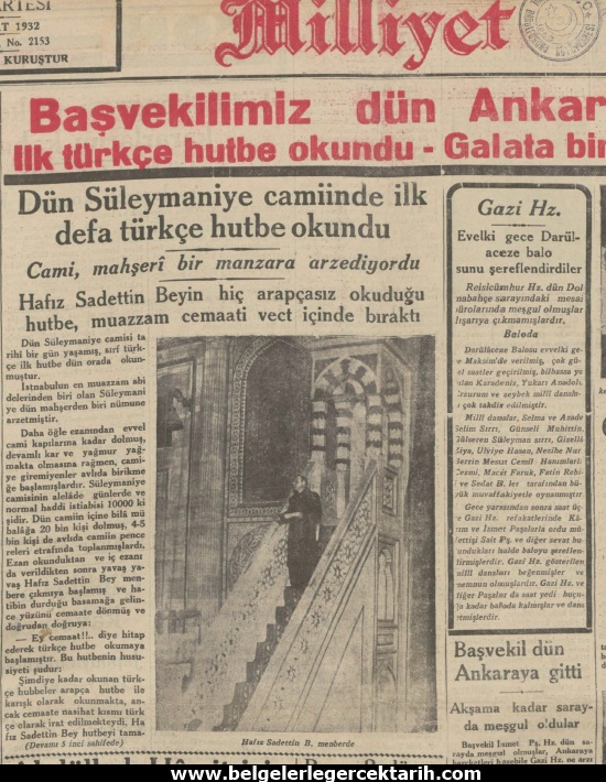 Diyanet Işleri Başkanlığı’nın razı olduğu bu “ara formül”e rağmen Sadettin Kaynak, M. Kemal’in Diyanet’e sormadan verdiği bir talimatla 5 Şubat 1932 günü Süleymaniye Camii’nde hutbenin “tamamını” Türkçe okur ve bu haber gazetelere manşet olur.[29]