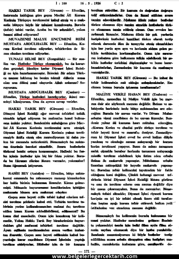 [16] TBMM Zabıt Ceridesi, Devre 2, Cild 25, Içtima 100, 16 Mayıs 1926, sayfa 171.