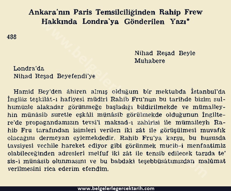 Ancak bütün bu temaslar, yukarıda verilen belgelerde de görüldüğü üzere, M. Kemal’in bilgisi dahilindeydi. Zaten Nihat Reşat’ı o vazifelere gönderen bizzat M. Kemal idi. Nitekim kemalist Prof. Tarık Zafer Tunaya’nın Paris Büyükelçiliği Arşivi’nde bulunan bir belgeden naklettiğine göre, Rahip Fru’nun (Frew) Istanbul’da ingiliz gizli haberalma örgütünün yöneticisi olduğu Dr. Nihat Reşat Bey’e bildirilmiş ve; “Rahip Fru’ya karşı, bu hususda tavsiyesi vechile (üzerine) hareket ediyor gibi” görünmesi tembih edilmişti.[19]