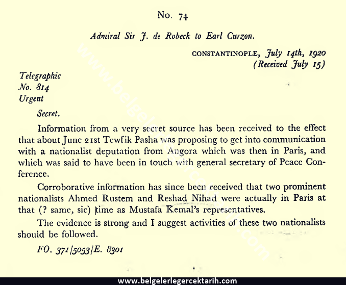Istanbul’daki Ingiliz Yüksek Komiseri Amiral De Robeck’ten Ingiliz Dışişleri Bakanı Lord Curzon’a gönderilen 14 Temmuz 1920 tarihli bir şifre telgrafta ise; “Ahmet Rüstem ve Nihat Reşat’ın Paris’te bulunduklarının öğrenildiği ve bu iki milliyetçinin faaliyetlerinin izlenmesi” gerektiği bildiriliyordu.[12]