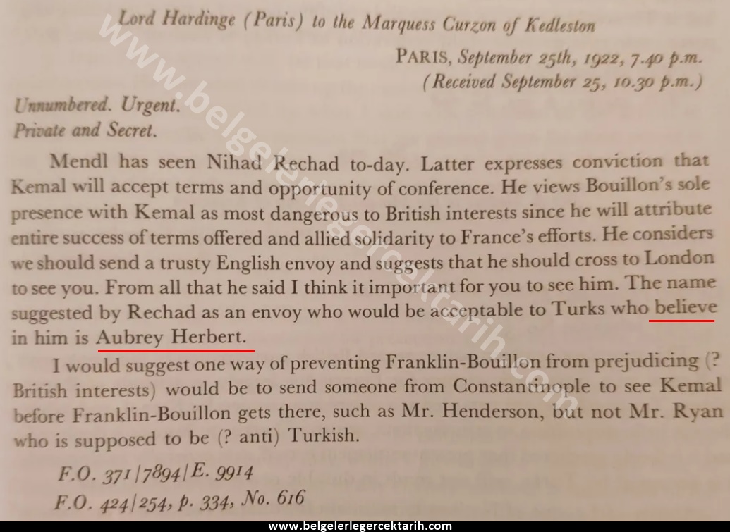 “Mendl bugün Nihat Reşat ile yaptığı bir görüşmenin sonunda, Reşat’ın konuyla ilgili nihai kanaatinin M. Kemal’in konferans tarafından kendisine sunulan şartları ve fırsatları kabul edeceği yönünde olduğunu beyan etti. Müttefik kuvvetlerin elde ettiği zaferin neticesinde konferansta sunulan şartların ve tüm başarının Bouillon tarafından Fransa’nın çabalarıyla gerçekleşmiş gibi Fransa’ya ithaf edilmesini göz önüne aldığında, kendisi Bouillon’un varlığı ve Kemal ile ortaklığını Ingiliz çıkarları için en büyük tehlike olarak görüyor. Reşat, tarafımızdan M.Kemal’e güvenilir bir elçi göndermeyi değerlendirmemiz gerektiğini belirtip, ayrıca sizinle şahsen görüşmek için Londra’ya geçmeyi öneriyor. Kendisiyle yapmış olduğum tüm bu görüşmeden yaptığım çıkarım, Reşat’ın teklifini kabul edip kendisiyle görüşmenizin önem arz eden bir gereklilik olduğudur. Reşat’ın Kemal ile görüşmesi için önerdiği elçi Türklerce de kabul edilebilecek biri olan, Türk tarafının kendisine güvendiği Aubrey Herbert’tir. Bouillon’un Ingiliz politikasına karşı tutumunu ve Kemal’i etki altında bırakmasını engellemek adına bulunabileceğim bir tavsiye de Kemal ile görüşmesi için Istanbul’a Bouillon oraya varmadan önce birini göndermemizdir, Türk karşıtı olmasıyla bilinen sayın Ryan gibi değil ama mesela sayın Henderson gibi biri olabilir.”