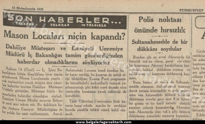 Cumhuriyet gazetesinin “kapatıldığını” duyurduğu haber 14 Ekim 1935 tarihini taşır. Halbuki Cumhuriyet gazetesi bu ilanı ertesi gün neşrettiği “Mason Locaları niçin kapandı?” başlıklı haberinde “Dahili Müsteşarı ve Emniyeti Umumiye Müdürü Iç Bakanlığın tamim gönderdiğinden haberdar olmadıklarını söylüyorlar” diyerek düzeltmiştir: