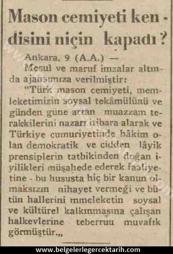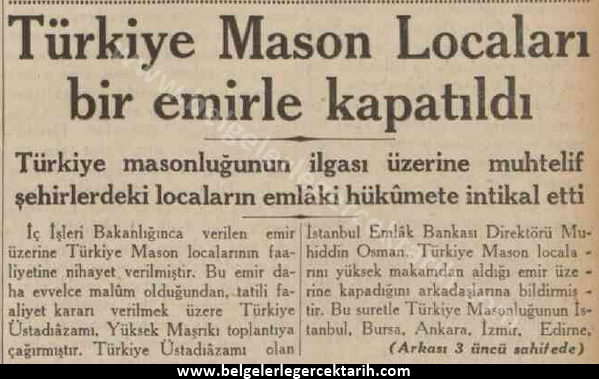 “Iç Işleri Bakanlığınca verilen emir üzerine Türkiye Mason localarının faaliyetine nihayet verilmiştir.”[1]