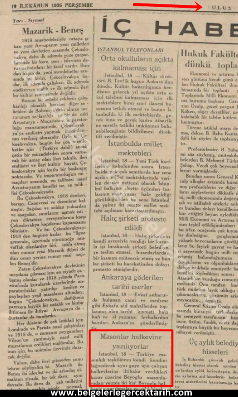M. Kemal’e ait olduğu bilinen “Ulus” gazetesinin verdiği “Masonlar halkevine yazılıyorlar” başlıklı haberde ise şunlar yazar:
