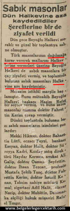 “Dün gece Beyoğlu Halkevi meraklı ve güzel bir toplantıya sahne olmuştur. Türk masonlarının dağılmağa karar vererek mallarını Halkevlerine vermeleri üzerine Beyoğlu Halkevi de sabık masonlara bir çay ziyafeti vermiş ve toplantıda bulunan sabık masonları Halkevine aza (üye) kaydetmiştir.”[3]