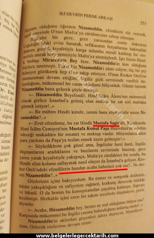 Bay manipülatör akabinde başka bir konuya atlıyor ve Milli Mücadele’ye maddi destek vermek süsüyle Ankara’ya geldiği bilinen Ingiliz casusu Hintli Mustafa Sagir hakkında; “M. Kemal’e suikast düzenleyen bir Ingiliz ajanıydı” demek suretiyle yeni bir hezeyanda daha bulunuyor.