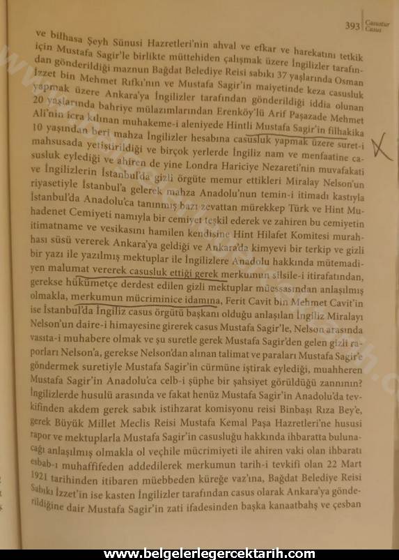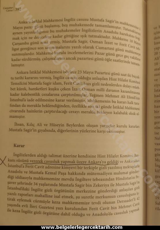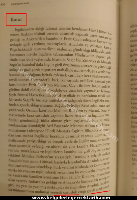 “Hintli Mustafa Sagir’in filhakika 10 yaşından beri mahza Ingilizler hesabına casusluk yapmak üzere suret-i mahsusada yetiştirildiği ve birçok yerlerde Ingiliz nam ve menfaatine casusluk eylediği ve ahiren de yine Londra Hariciye Nezareti’nin muvafakati ve Ingilizlerin Istanbul’da gizli örgüte memur ettikleri Miralay Nelson’un riyasetiyle Istanbul’a gelerek mahza Anadolu’nun temin-i itimadı (itimadını kazanmak) kastıyla Istanbul’da Anadolu’ca tanınmış bazı zevattan mürekkep Türk ve Hint Muhadenet Cemiyeti namıyla bir cemiyet teşkil ederek ve zahiren bu cemiyetin itimatname ve vesikasını hamilen kendisine Hint Hilafet Komitesi murahhası süsü vererek Ankara’ya geldiği ve Ankara’da kimyevi bir terkip ve gizli bir yazı ile yazılmış mektuplar ile Ingilizlere Anadolu hakkında mütemadiyen malumat vererek casusluk ettiği gerek merkumun silsile-i itirafatından, gerekse hükümetçe derdest edilen gizli mektuplar müessasından anlaşılmış olmakla, merkumun mücrimince idamına…”[8]