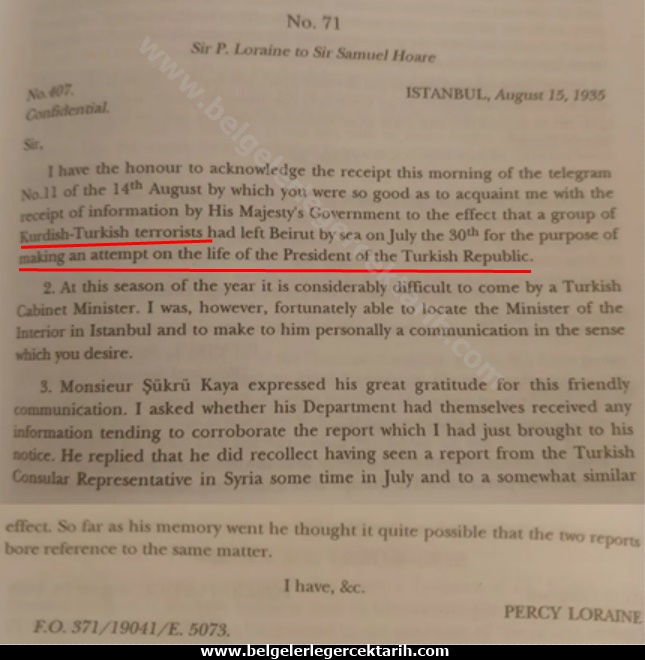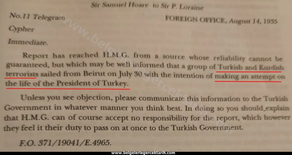 Ertesi gün Ingiltere Büyükelçisi Percy Loraine tarafından Ingiltere Dışişleri Bakanı Samuel Hoare’a gönderilen cevapta ise özetle şu bilgi veriliyordu: