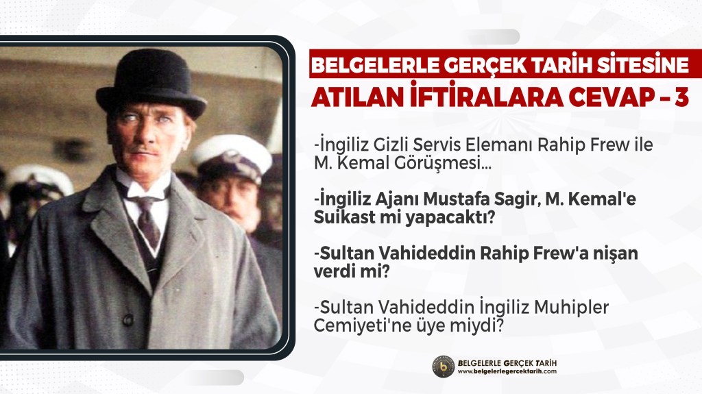 Işte bu, Rahip Frew’un emri altındaki cemiyetin, Sultan Vahideddin tarafından “zahirde” görülen ve takdirle karşılanan “aleni ve medeni” cephesiydi. Bu yüzden de mazur görülebilir. Fakat aynı mazeret maalesef M. Kemal için geçerli değildir. Neden? Hani bay manipülatörün Mustafa Sagir meselesinde coşkuyla vurguladığı üzere, M. Kemal onun casus olduğunu bir bakışta “şıp” diye anlayıvermişti ya… Işte o yüzden. Dolayısıyla kemalist mantıkla hareket edildiğinde, böyle “insanüstü” bir varlığın (!) “aldanması” söz konusu olamazdı. O halde Rahip Frew meselesinde mecburen; “içyüzünü bilerek, isteyerek böyle söyledi” demekten başka bir seçenekleri kalmıyor. Ya yutkunup, “Atamız aldandı” diyecekler, ya da “ihaneti gördüğü halde onu methetti” diyenlerin bu iddialarını sineye çekecekler!.. Bu kadar net.