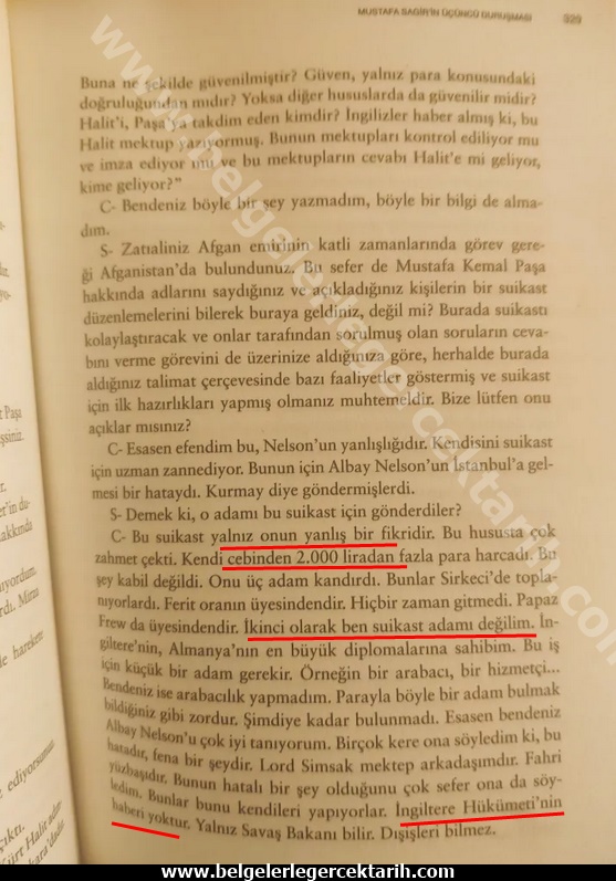 Ancak bay manipülatör, TV ekranında kemalist Sabahattin Özel’in “Casustur Casus” adlı eserini kaynak gösteriyor. Halbuki adı geçen kitapta yer alan “mahkeme tutanakları”na bakıldığında, Mustafa Sagir’in suikast için gelmediği, esas gayesinin istihbarat toplamak olduğu, suikast planının Ingiliz resmi makamları tarafından değil, Albay Nelson’un “kendi fikri” olduğu ve bunun için kendi cebinden 2.000 liradan fazla para harcadığı, açıkça görülür. Mahkeme tutanaklarından aynen naklediyorum:
